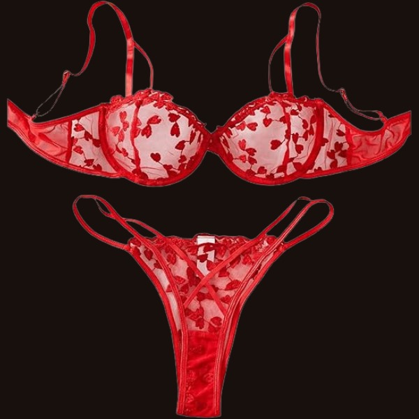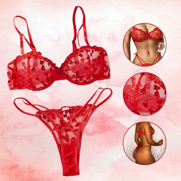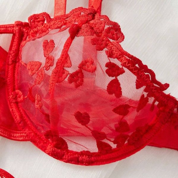 Deze rode lingerieset is de perfecte keuze voor Valentijnsdag! Met ingewikkelde hartborduursels en delicate transparante mesh-details is deze set ontworpen om je romantische allure te versterken.