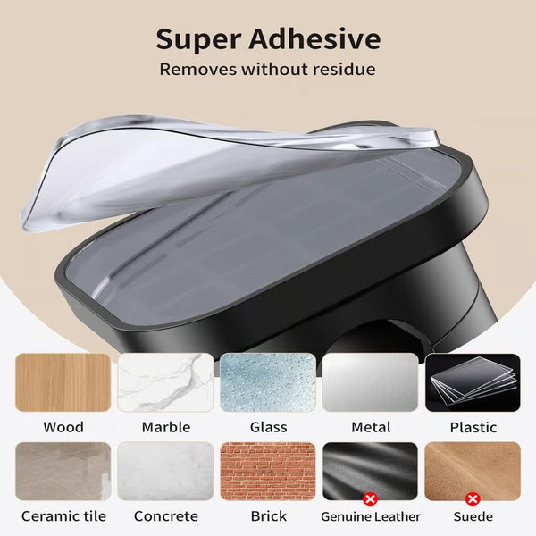 Hecht stevig op vlakke oppervlakken zoals hout, tegels, metaal en gladde muren.