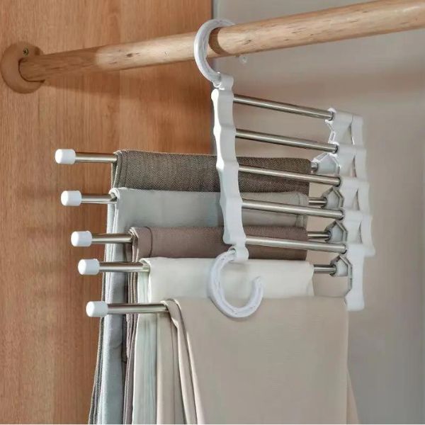 Wacht niet langer! Verbeter de organisatie van je garderobe en bespaar ruimte met deze uitstekende broekhanger met 5 niveaus.